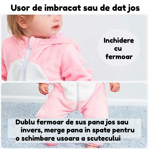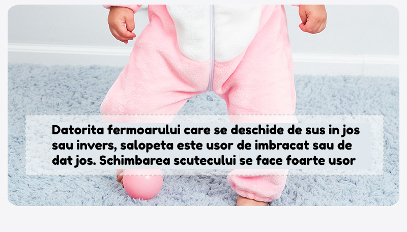 Usor de Imbracat/Dezbracat: Inchidere cu fermoar pentru o imbracare si dezbracare rapida, iar fermoarul dublu faciliteaza schimbarea scutecelor.