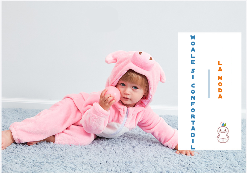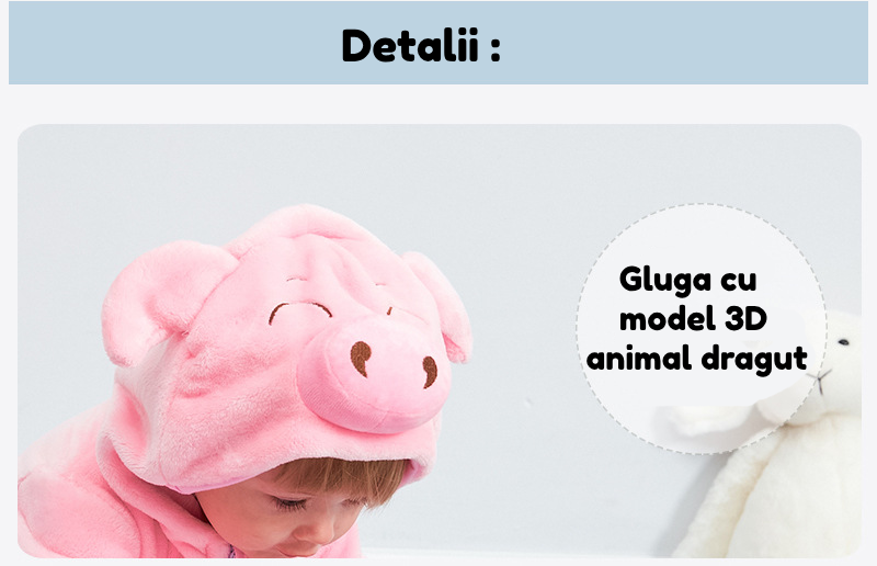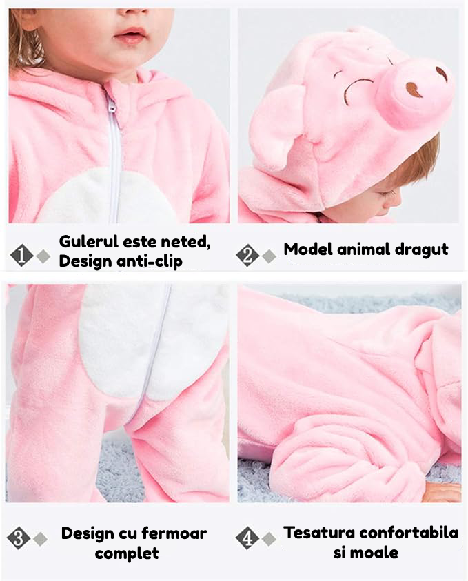 PLIN DE DETALII AMUZANTE - Aceasta tinuta adorabila prezinta o gluga cu ochi si urechi pentru un efect complet de purcelus roz. Inchiderea cu fermoar faciliteaza imbracatul si dezbracatul rapid, iar deschiderea completa de la spate permite o schimbare usoara a scutecelor.